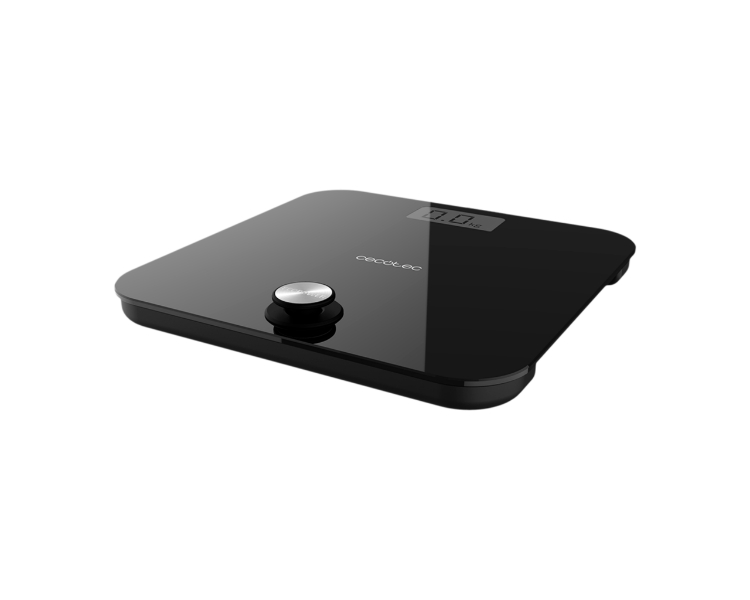 Báscula de baño de Cecotec con pulsador, superficie de vidrio templado de alta seguridad y sensores de precisión.