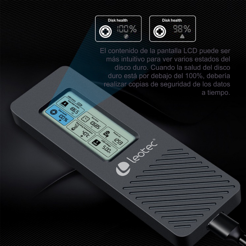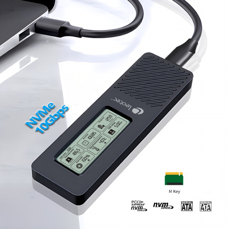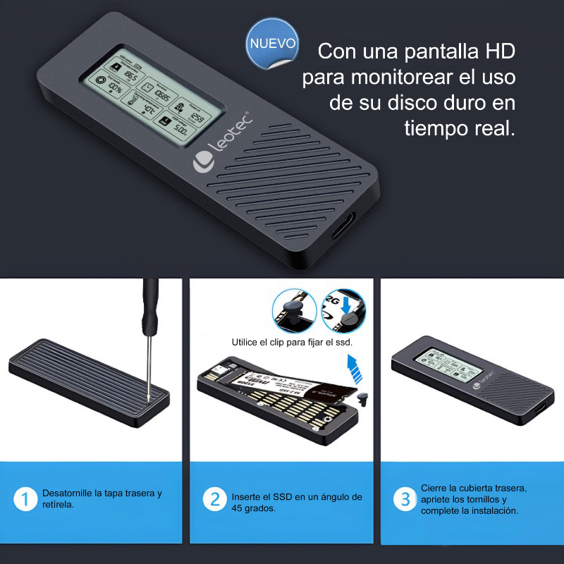USB-C 3.2/ Hasta 10Gbps/ Pantalla LCD/ Compatible con M.2 NVMe 2280 de hasta 4TB