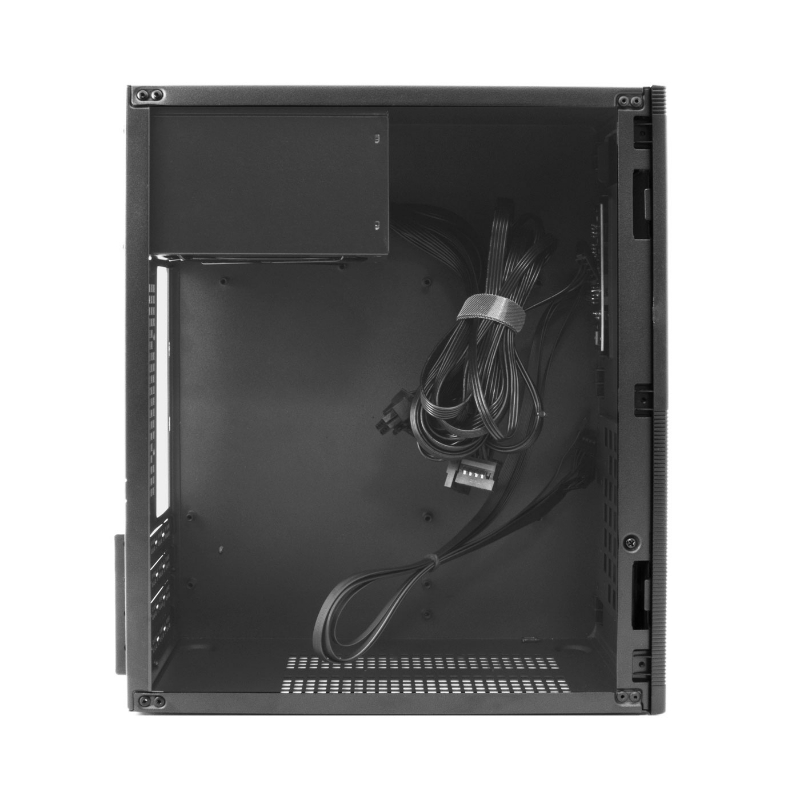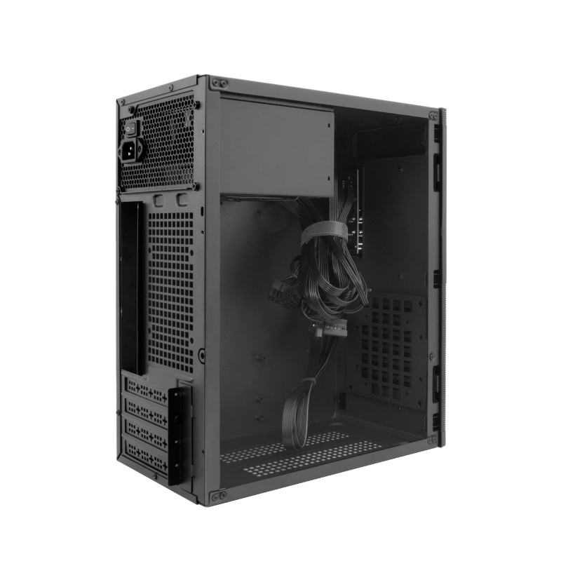 Chasis Micro ATX de color negro fabricado en acero SGCC de 0.8mm con frontal de ABS. Disponible sin fuente de alimentación o con modelo BASIC500GR. Incluye bahías para discos de 3.5” y 2.5” y dispone de puertos USB 3.0 y USB 2.0 frontales, con conector combo HD-Audio. Compatible con ventiladores traseros de 90mm, admite coolers de CPU de hasta 130mm. Cuenta con 4 slots de expansión y medidas de 160 x 350 x 310 mm. Seguridad con soporte para candado y cierre Kesington. Peso: 2.59 kg.