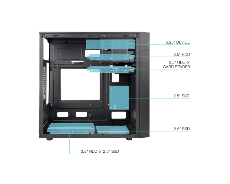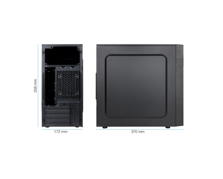 Bahias: Externas: 1 x 5'25, 1 x 3'5 - Internas: 2 x 3'5 , 2 x 2'5 Color del Producto: Negro F.A.: No Formato: Micro ATX Formato F.A.: ATX Medidas: 330 x 170 x 346mm Potencia F.A.: Sin fuente