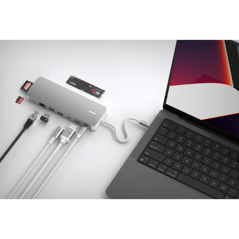Este hub multiport LINQ 9in1 Pro Studio está diseñado para mejorar tu conectividad de manera sencilla. Solo conecta el hub a tu MacBook, Microsoft Surface, Chromebook, HP o cualquier otro portátil compatible con USB-C. No es necesario preocuparse por controladores adicionales; solo conéctalo y listo. El sutil LED se ilumina cuando el hub está en uso.