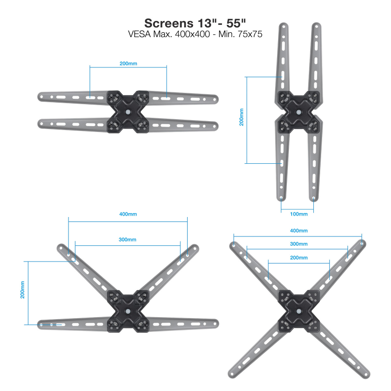13"-55"/ Inclinación, giro, rotación/ Peso máximo 25Kg/ VESA máximo 300x200mm