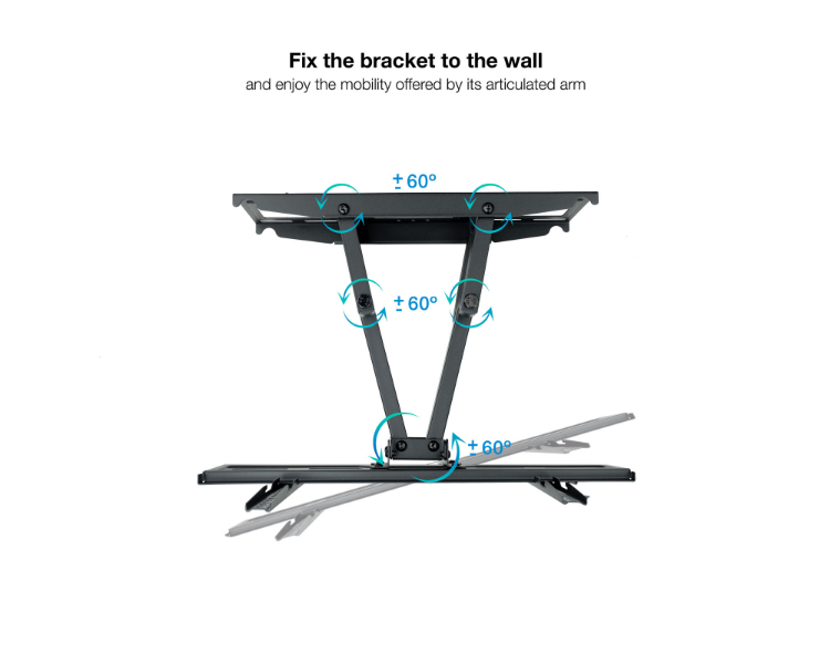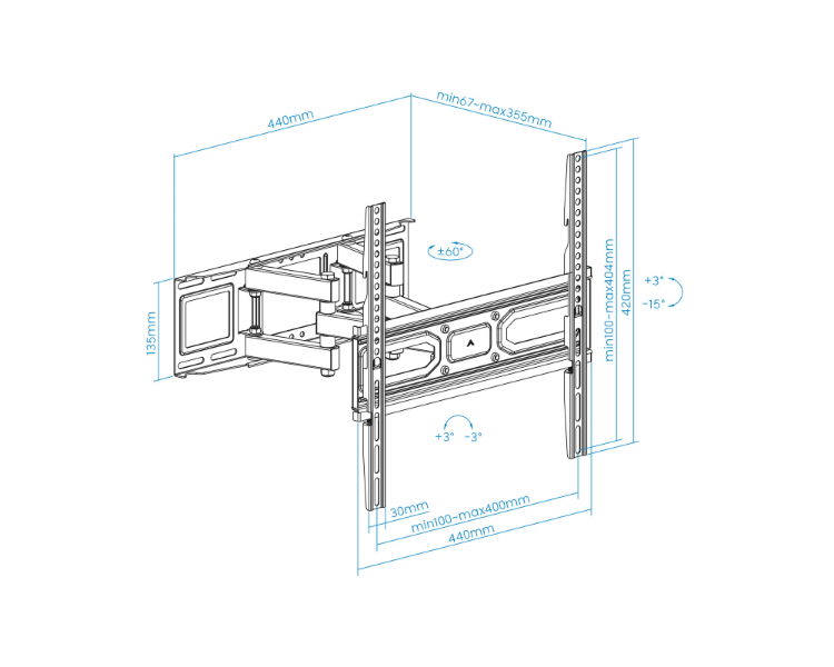32-70"/ Máximo 40kg/ VESA Máximo 400x400/ Inclinación, giro y nivelación/ Distancia de pared de 67 a 355mm