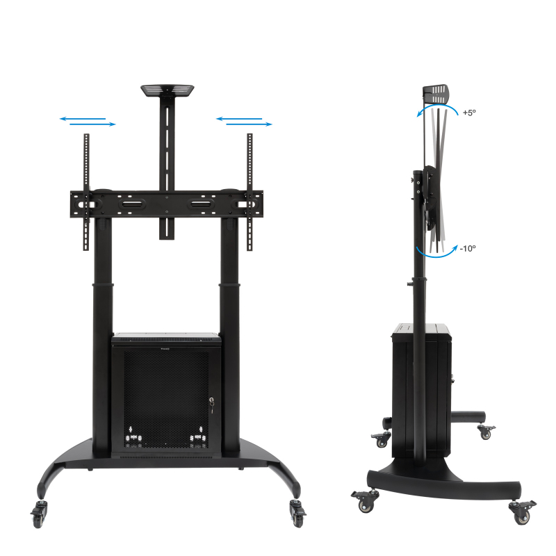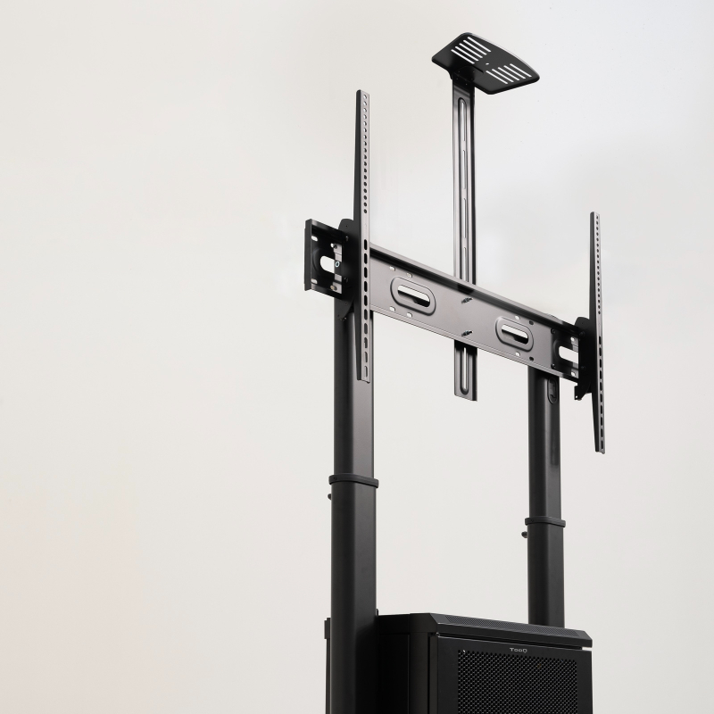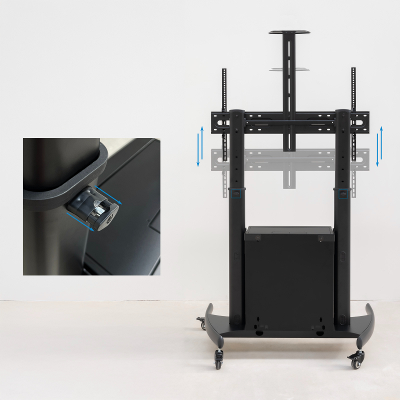 Pantallas de 60 a 100"/ VESA Max 1000x600/ Hasta 100kg/ Bandeja superior regulable/ Ajustable en altura/ Armario multiusos con cerradura